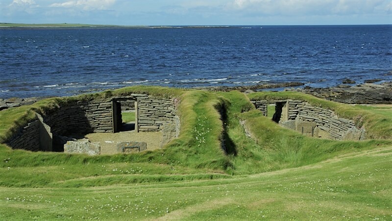 This Neolithic farm on the island of Papa Westray is the oldest surviving building in the UK. It has two adjacent rounded rectangular thick-walled stone buildings with built-in stone furniture.